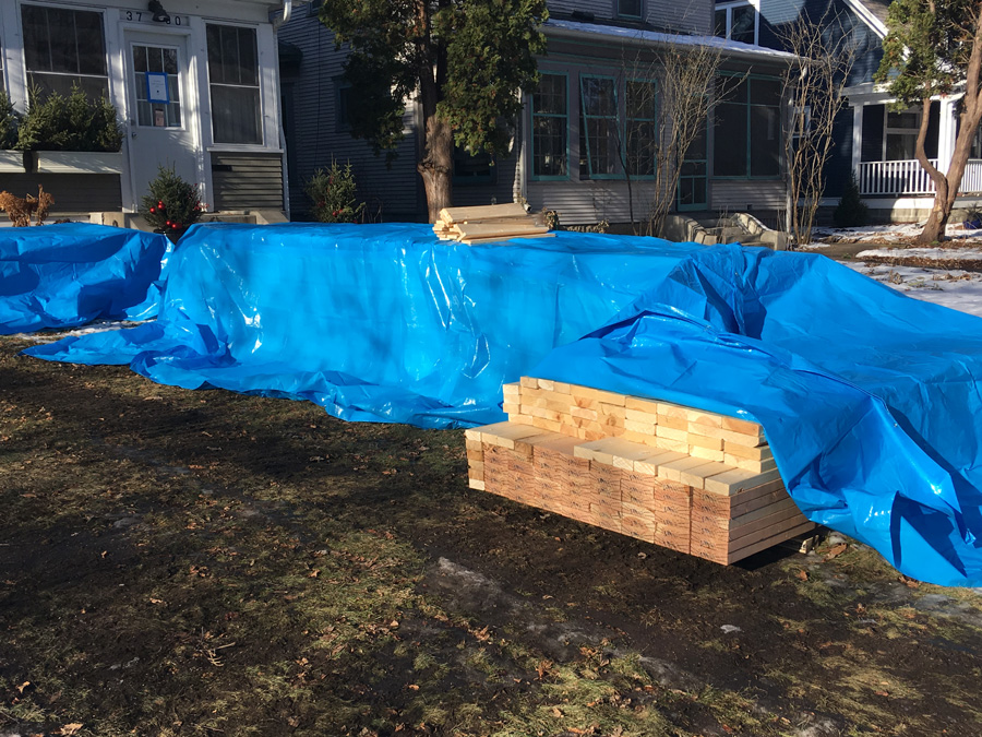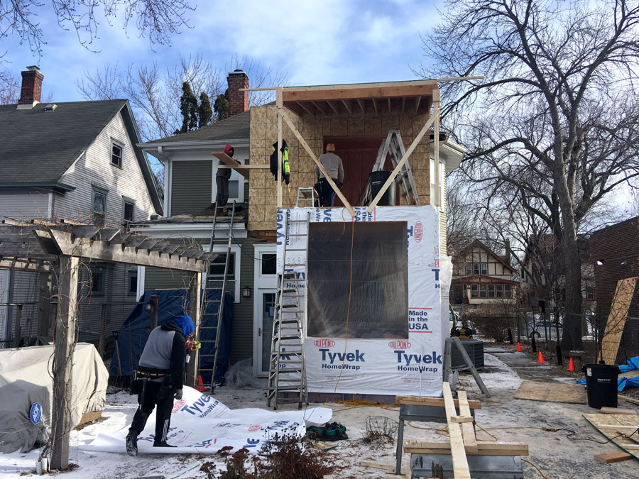 The lumber delivery arrives, but before we begin framing another round of demo has to happen. The siding and trim are removed from the exterior back wall where the house will open to the Addition, and then the 1st-floor wall will be demoed. Before removing the exterior walls, we build insulated temporary walls that we’ll remove after installing the Addition walls and windows.