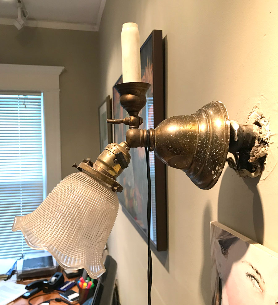 A mystery pipe appeared during the second round of demo. After some sleuthing, the plumber discovered the pipe was an unused gas line connected to a light fixture original to the home. The light fixture contained fittings for both gas and electricity. We cut and removed the unused pipe.