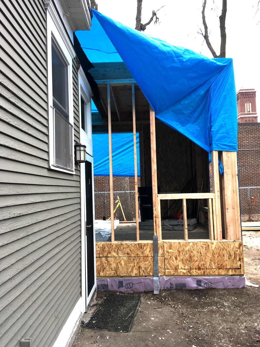 The floor for the Sunroom is framed in over the new Addition foundation leaving a crawl space below. A temp wall is installed and the home's exterior wall is removed.
