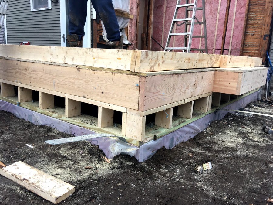 We start building the Sunroom floor over the new Addition foundation, leaving a crawlspace beneath.