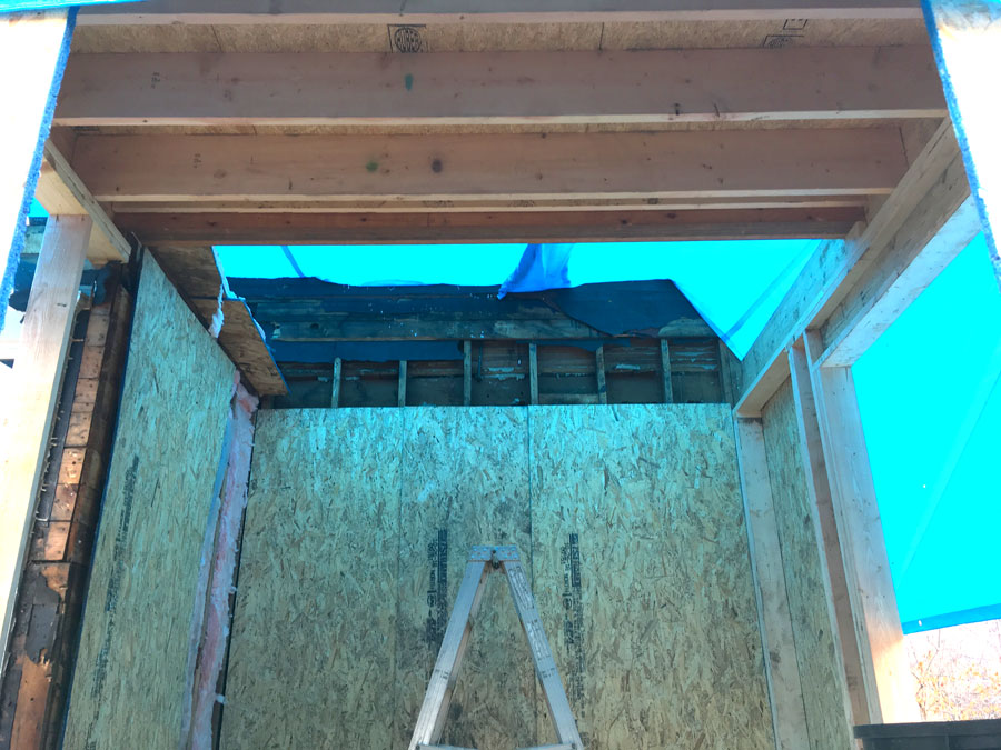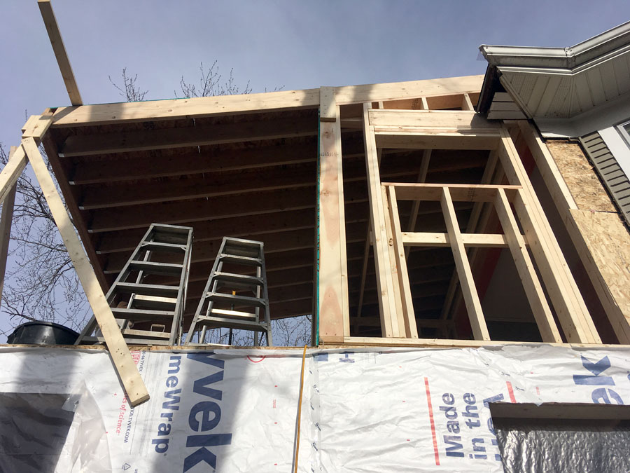 We're building the 2nd-floor porch and Bedroom extension. We installed another temporary wall (similar to the one on the 1st-floor) on the 2nd-floor before removing the Bedroom wall.