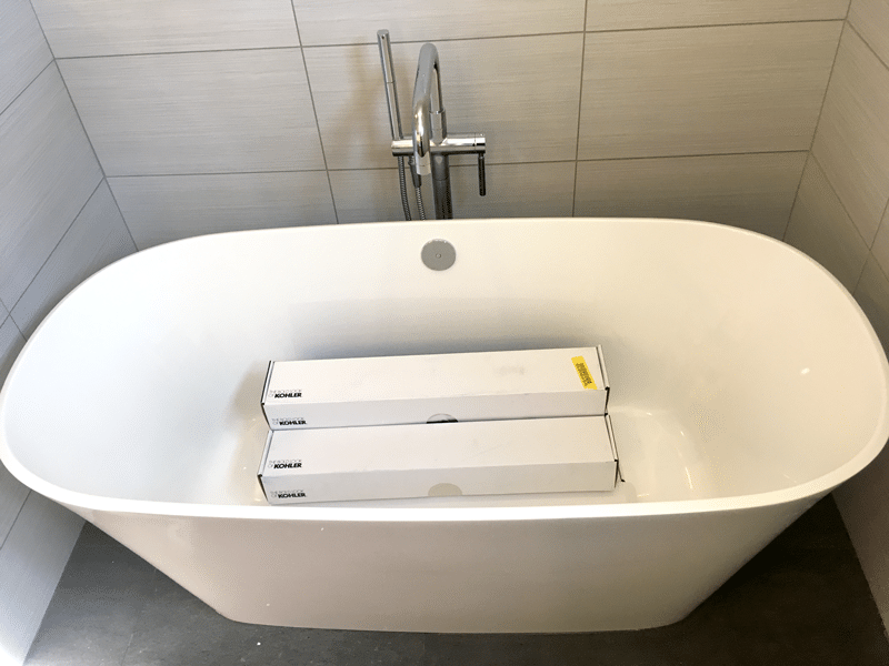 The design pairs a Victoria + Albert soaking tub with a Kohler Purist tub filler in polished chrome. The Kohler Purist towel bars are in their boxes ready for installation.