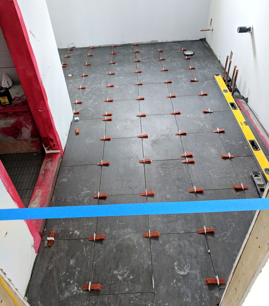 The large-format floor tile is laid in the Bathroom. When the thinset is dry, we’ll apply a dark grey grout to the tile.