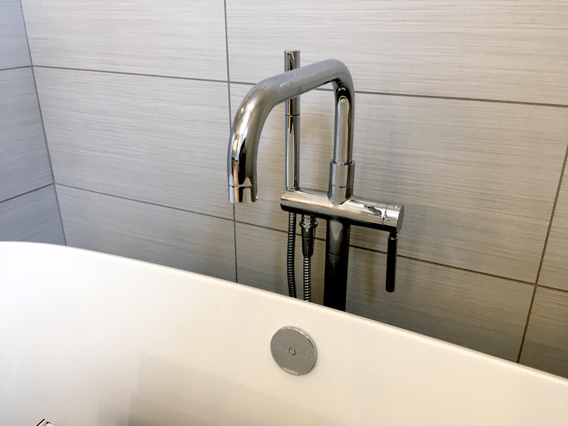 To achieve a Scandinavian modern aesthetic, we chose sleek plumbing fixtures with clean lines. The Toto toilet, Victoria + Albert soaking tub, and Kohler Purist tub filler are installed. Mounted accessories like the paper holder and towel bars were selected in a chrome finish to coordinate with the shower, tub, and vanity fixtures.