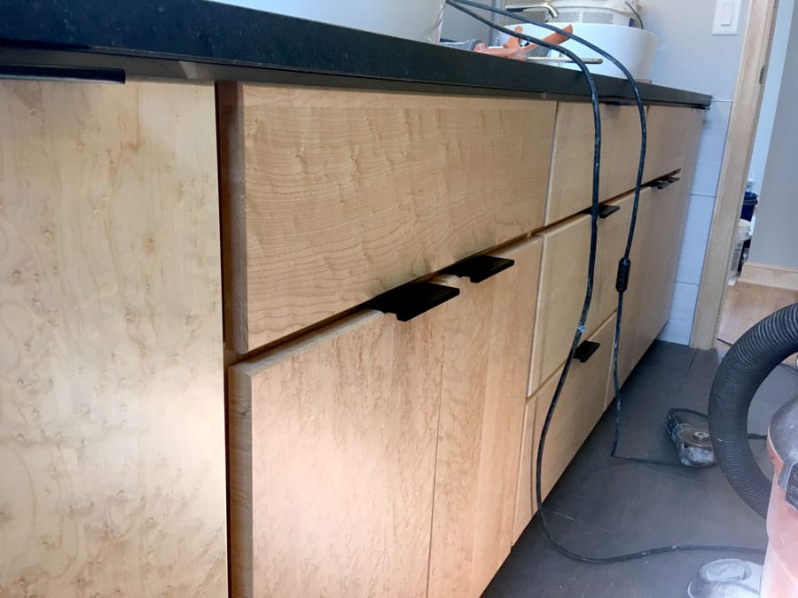 The birds-eye maple double vanity cabinet is installed. A clear finish is used to showcase the wood’s natural beauty. Next, the Absolute Black honed quartz countertop is attached to the vanity. The sinks and faucets are mounted to the vanity and connected to the plumbing. The vanity is finished with modern cabinet pulls in a flat black finish. The cabinet maker also provided birds-eye maple for the mirror frames above the vanity. The electrician will install four light sconces above the vanity, two flanking each mirror.