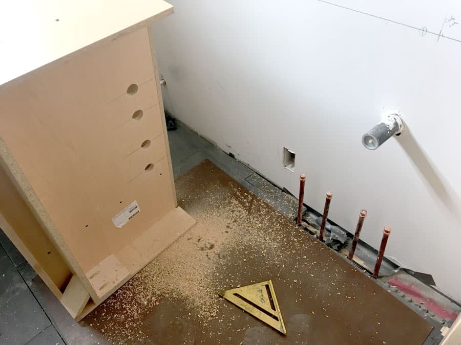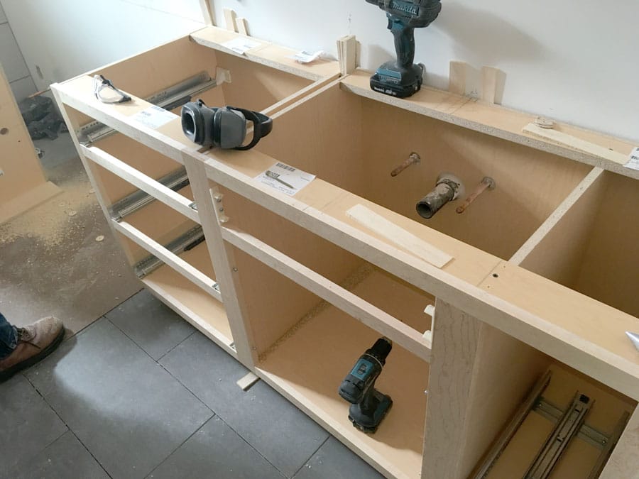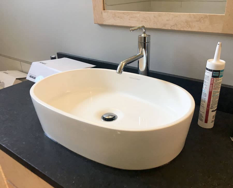 Now that the maple Bath vanity is in, we're ready to install fixtures and connect the plumbing.