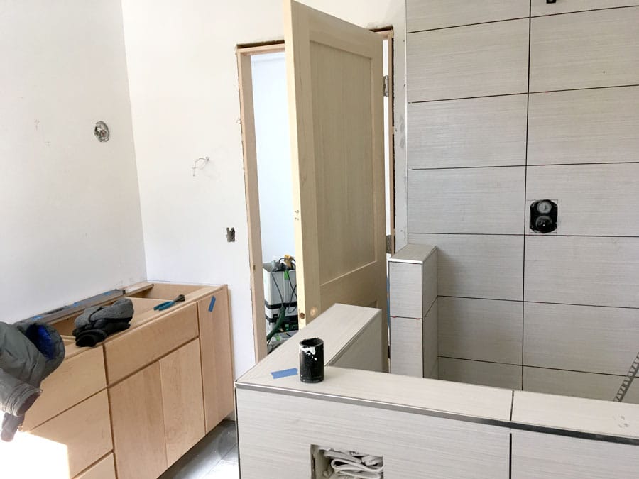 We’re finishing the Attic’s luxury Scandinavian modern Bath featuring a birds-eye maple vanity, soaking tub, and steam shower!