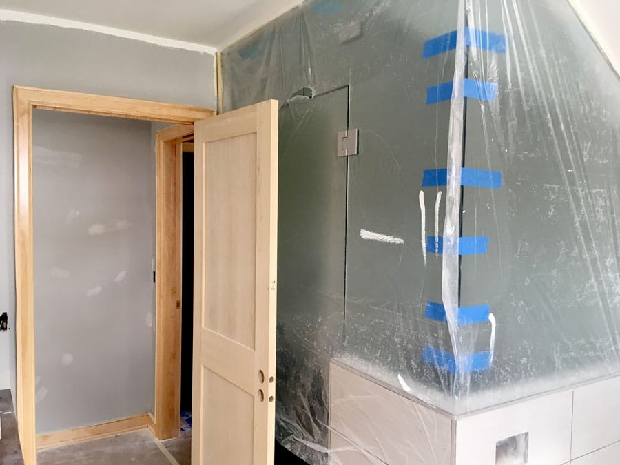 Now that the shower is tiled, we can install the glass panels to finish the enclosure.