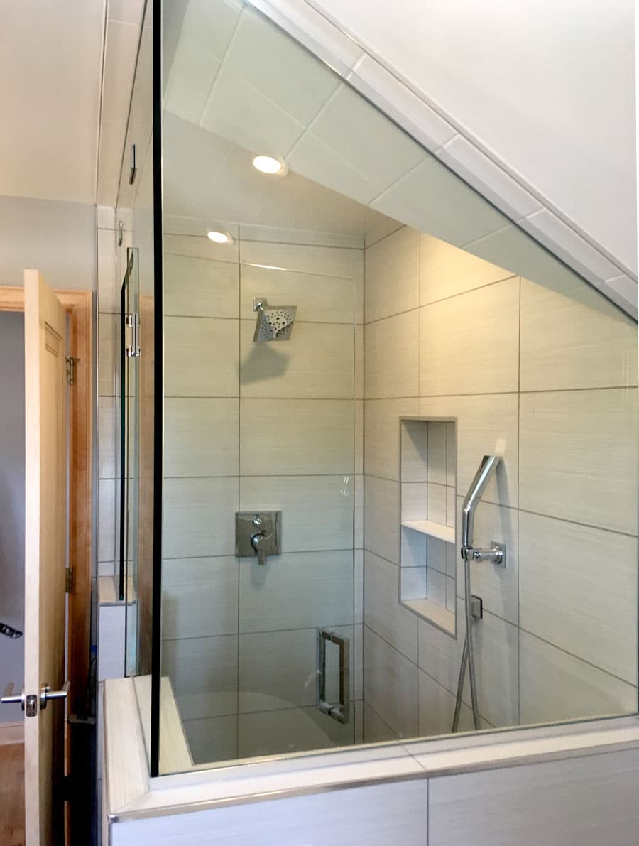 The new Bath has a tiled walk-in shower with unique glass panels, angled to fit the roof’s slope. The shower features handy built-ins, like a recessed shampoo/soap niche and bench. Light grey large format tile on the walls contrasts the dark grey mosaic tile shower floor. The tile edges are finished with metal trim pieces that create a clean, modern look. These trim pieces are available in several finishes. After tiling, we install the chrome Delta shower fixtures (showerhead, hand shower, faucet valve/trim) that coordinate with the tub filler, sink faucets, and accessories. Adding a modern chrome grab bar increases safety and facilitates aging in place. A frameless glass door with square chrome hinges completes the shower enclosure. As an added luxury, the enclosure also has a system that channels steam to a steam head in the shower.