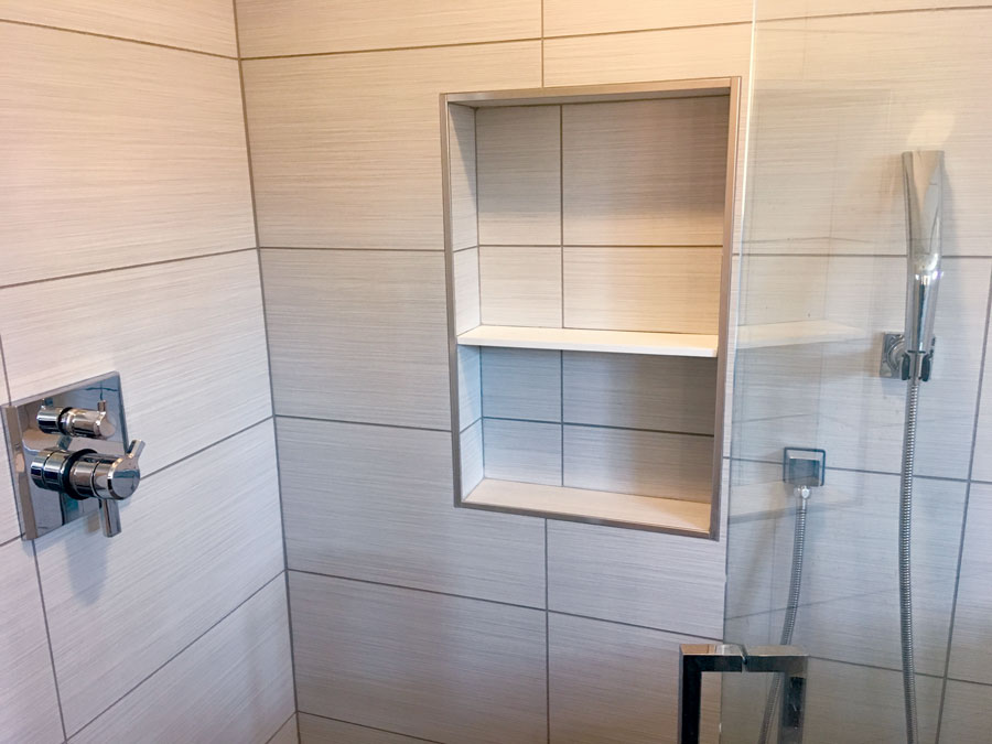 A built-in shower niche is handy for organizing bath and grooming products like shampoo, conditioner, and body wash. The tile edge is finished with a metal trim called a Schluter strip. Schluter strips are available in several metal finishes.