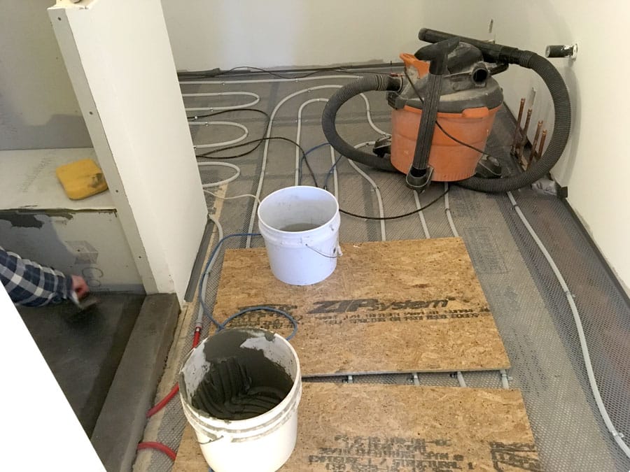 The hydronic radiant heat system is installed before the floor tile is laid.