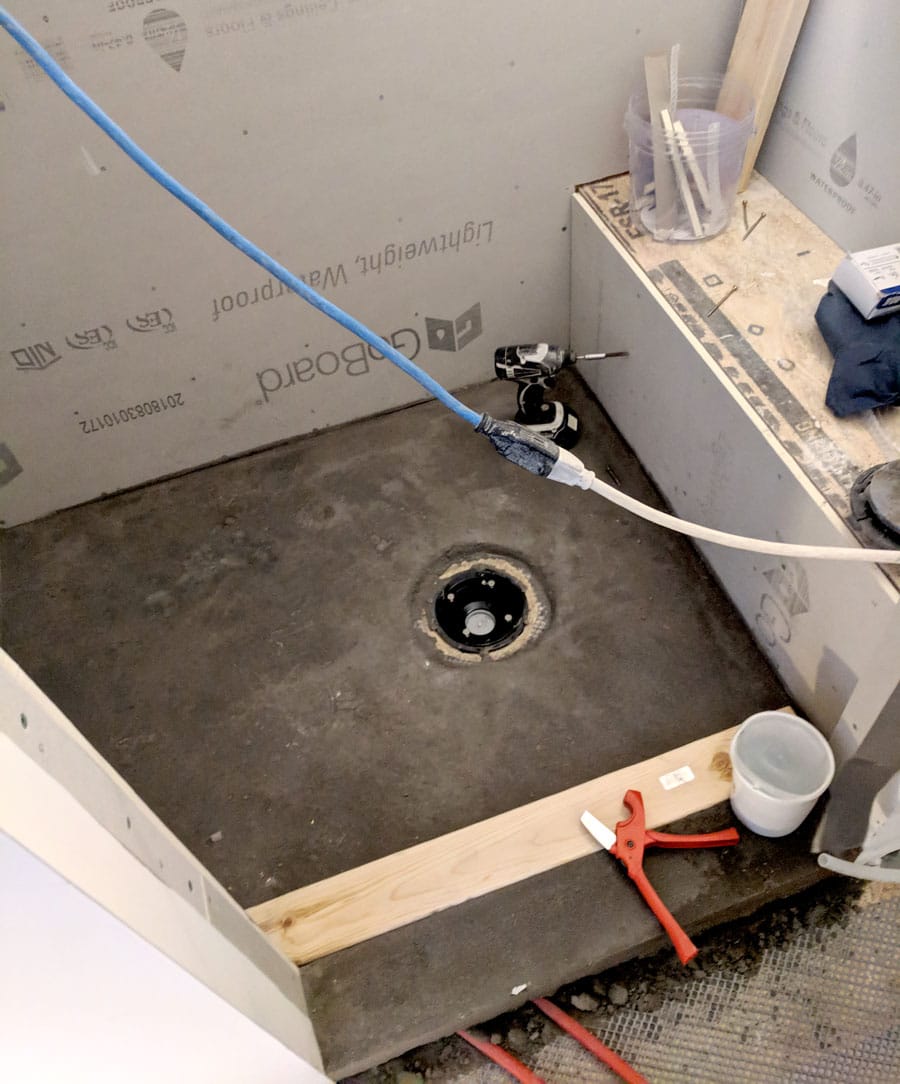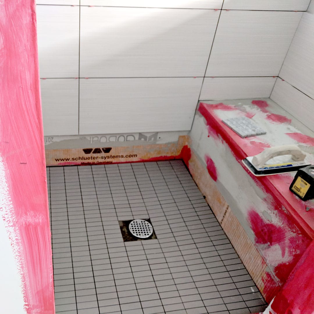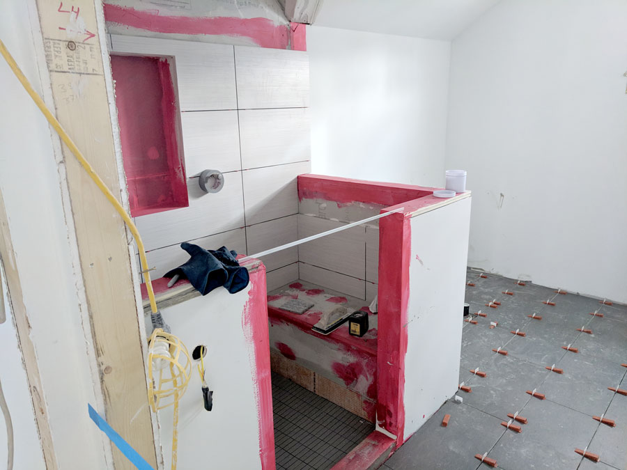 The shower enclosure is painted with RedGuard before tiling. The RedGuard creates a waterproof barrier under the tile. It also expands and contracts to prevent the tile from developing cracks.