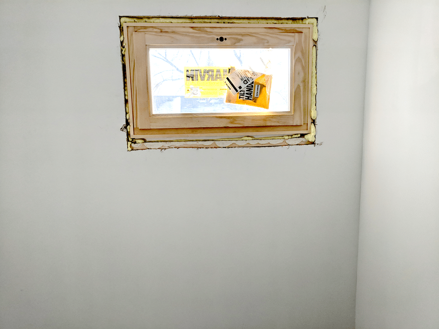 A hopper window is installed in the Bathroom. A hopper window opens into the house, unlike an awning window that opens outward away from the house.