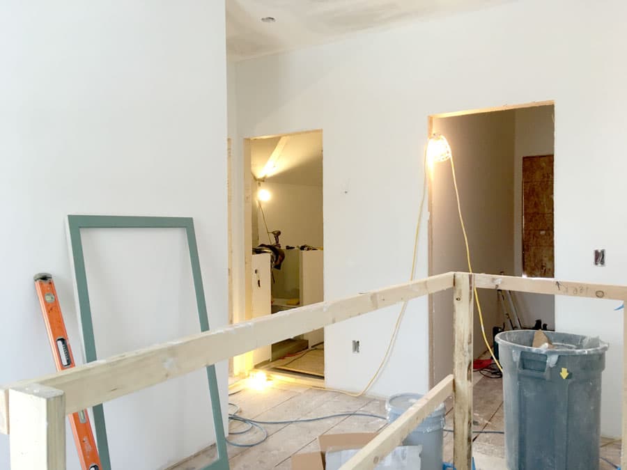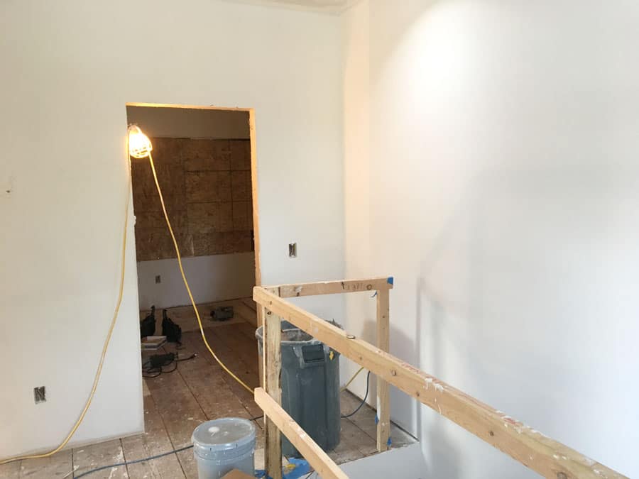We've installed a temporary stair railing. The new drywall has been taped, mudded, sanded, and primed.