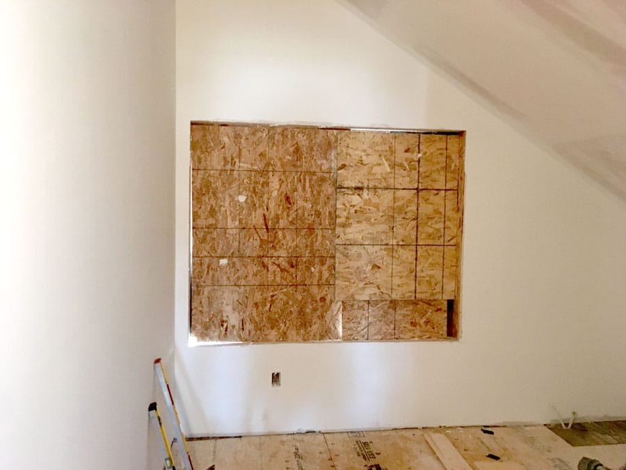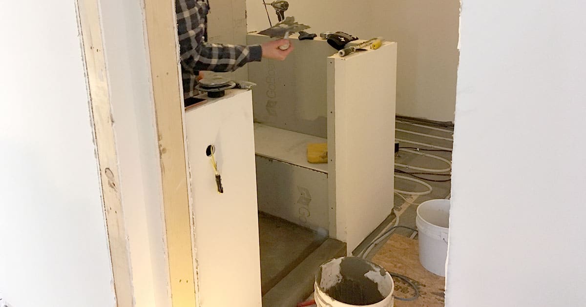 We drywalled over the framing for the shower stall base with built-in bench. Glass panels and a door will be added after tiling to finish the shower enclosure.