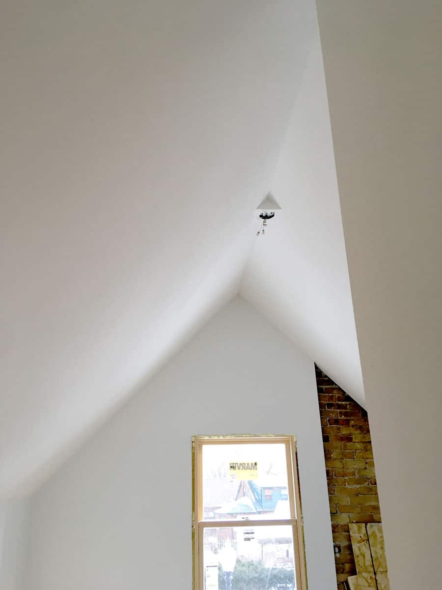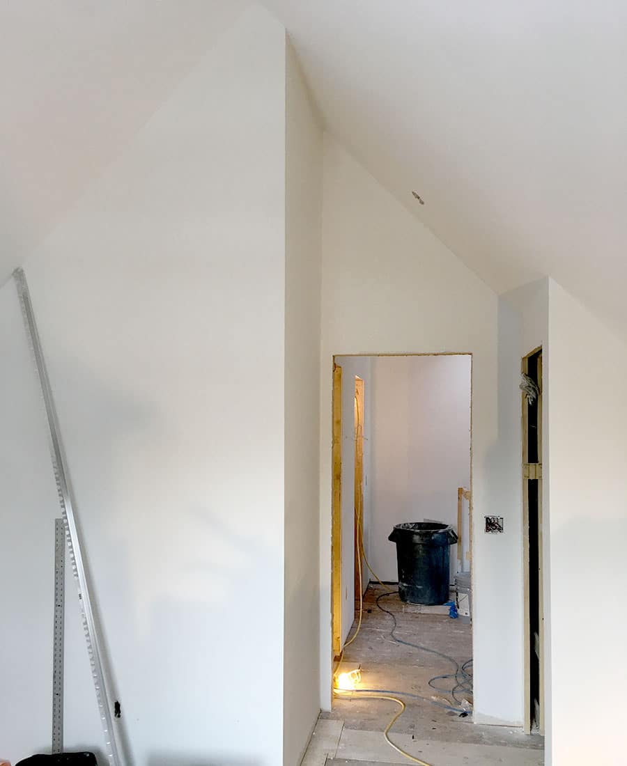 The Bedroom drywall has been taped, mudded, sanded, and primed. A fixture mounting box facilitates mounting a fan in the peak of the cathedral ceiling.