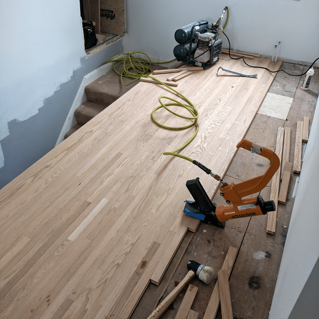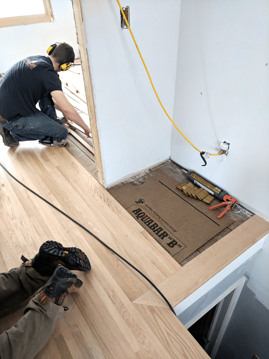 The hardwood flooring on the stair landing goes in.