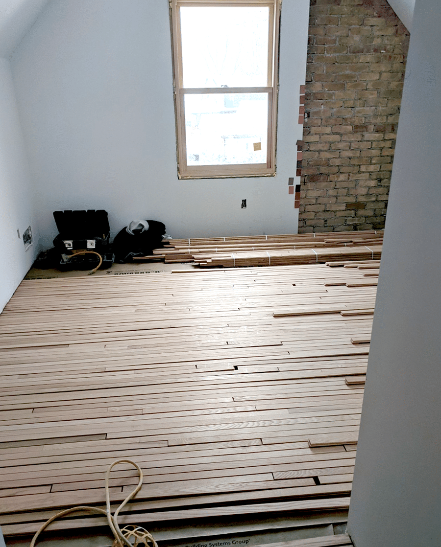 The hardwood floor is laid out in the new Attic Bedroom. We left the brick exposed on the existing chimney.
