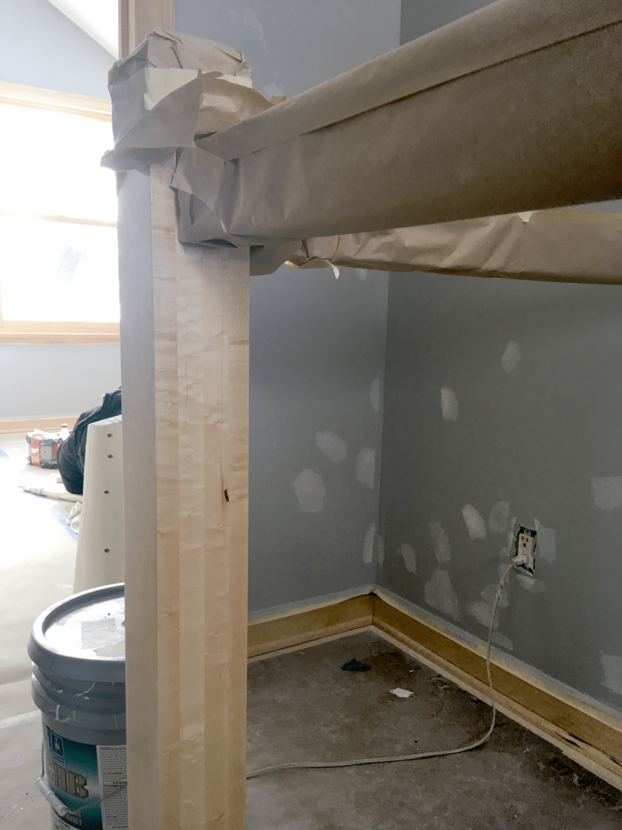 The stairway railing, with white balusters and birds-eye maple handrails and newel posts (chosen by the homeowner as a tribute to her late husband), will give the space a Scandinavian modern aesthetic.