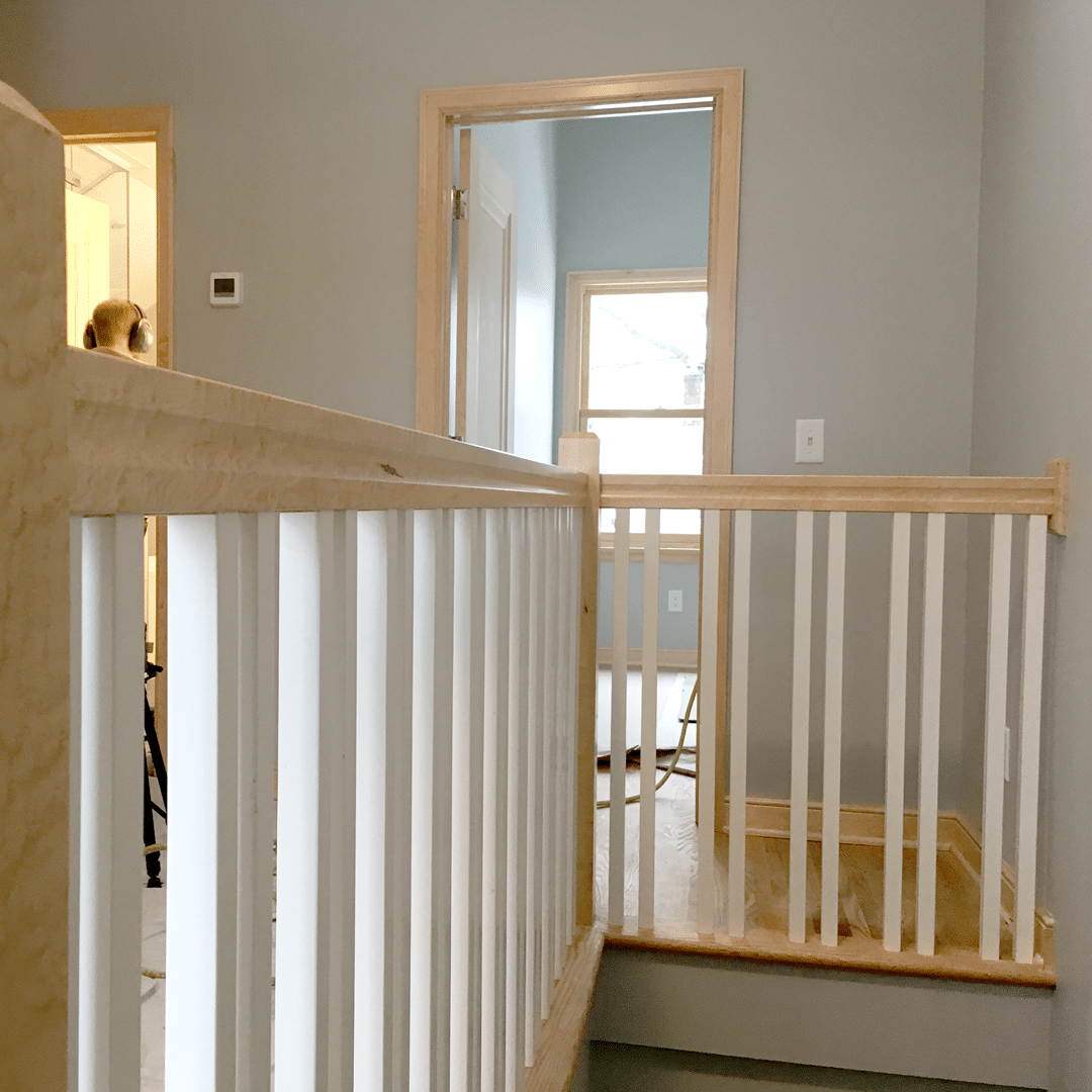 The finished railing is a two tone composition with white balusters and natural maple handrails and newel posts.