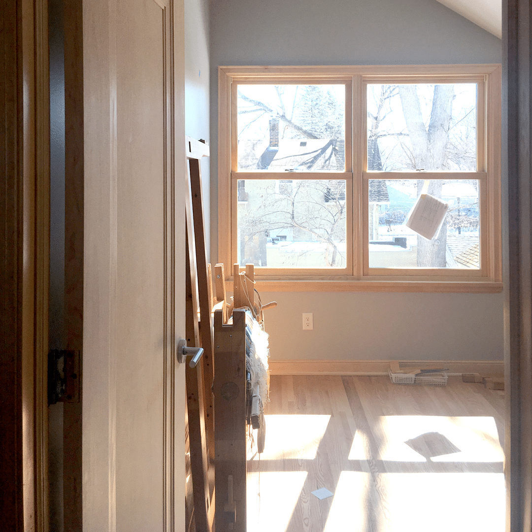 Woodwork! The doors, window trim, door casings, baseboards, and floors in the weaving room are installed! The floors have been sanded and are ready for a Monocoat Natural Oil finish. Monocoat is a single-coat, plant-based, sustainable finish with 0% VOCs.