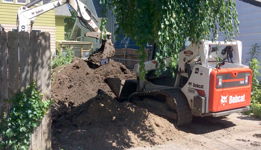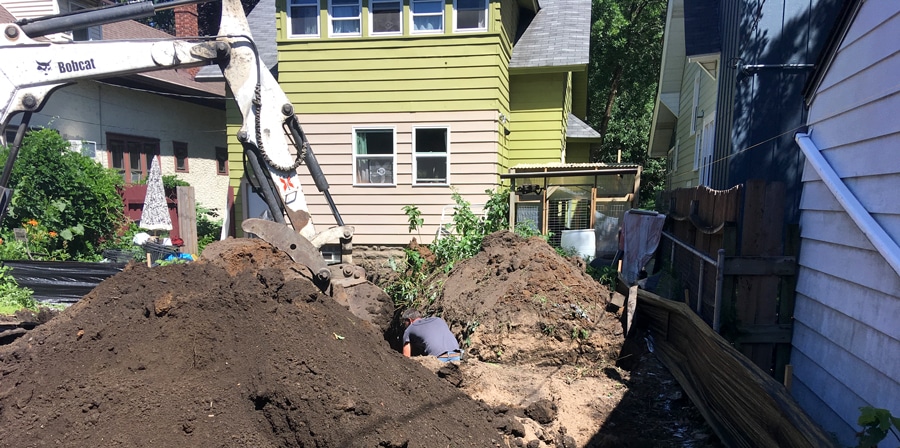 After demolition, the excavation begins. The earth will be removed to make room for frost footings and a foundation for the new garage and ADU. Frost footings are required for Minnesota’s climate. The footings guard against settling and slippage that can cause structural damage. Frost footings also prevent posts and beams from directly contacting the earth. Going below the frost line helps prevent soil movement due to frost called frost heave. We’ll also dig a trench from the main home to connect plumbing from the house to the new Garage/ADU.v