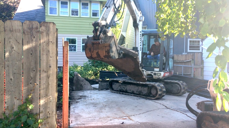 It's demo day! The old garage will be torn down, exposing the concrete parking pad which will also be removed.