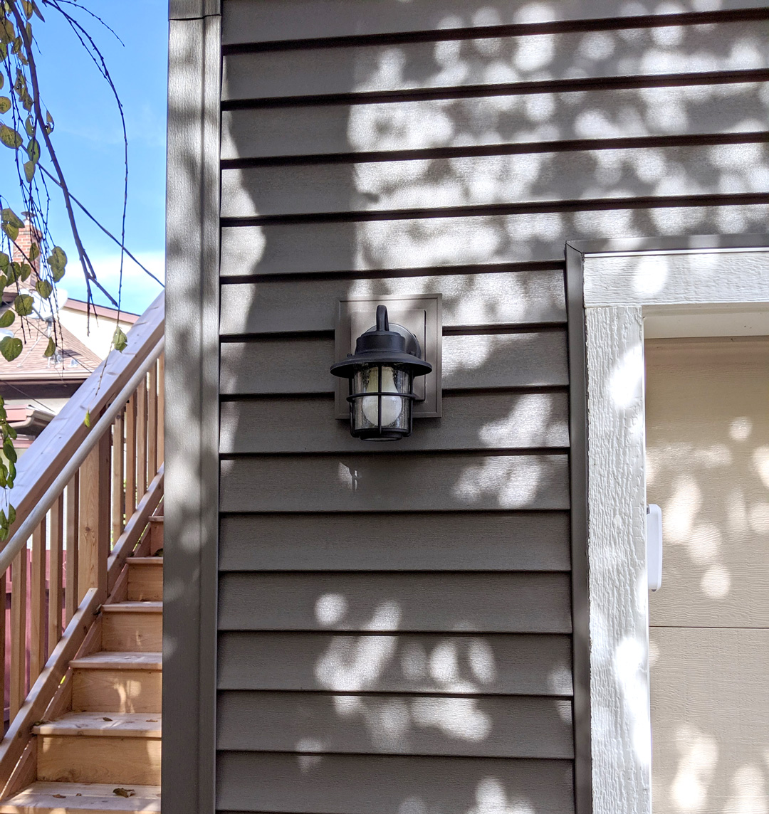 The homeowners chose classic black nautical-inspired exterior sconces to light the Garage/ADU. Lights are located by the service door, on either side of the Garage door, and next to the door for the future living space. This plan provides safety, lighting the foot and top of the ADU stairs, and the backyard path from the Garage service door to the main home.