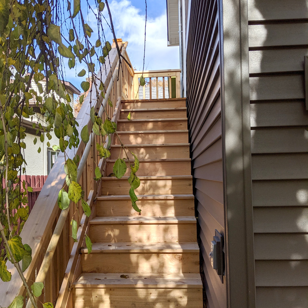 The exterior stairs to the future living space are cedar. The client has opted to finish them with stain or sealer themselves to save budget.