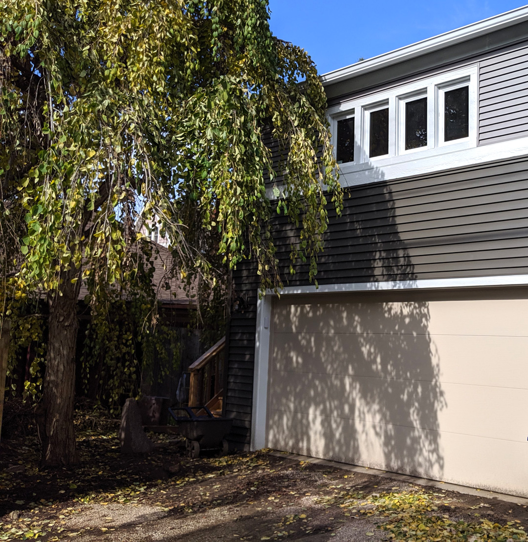 The Garage/ADU structure is complete and it is time to add the finishing touches to the exterior. To create visual interest, we used two colors and sizes of low-maintenance vinyl siding on the Garage/ADU separated by a white band board. We installed 4” lap in Misty Shadow on the lower section, and the upper portion is 3” lap in Harbor Grey. The crisp white trim contrasts the two tones of grey siding creating a clean classic look. The fascia, service door, and door to the future living space above the Garage were also painted white