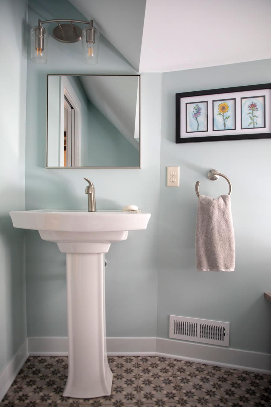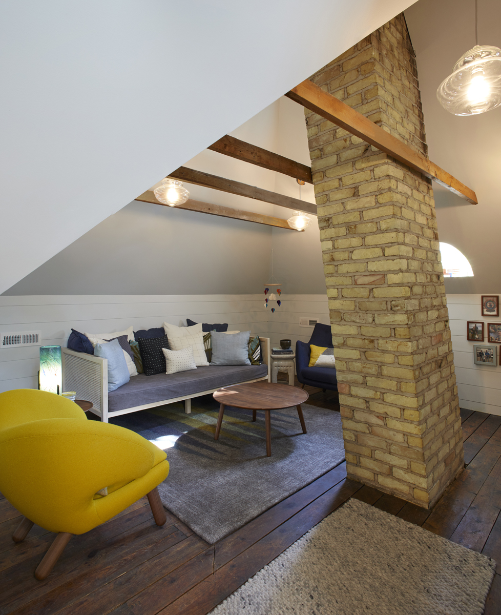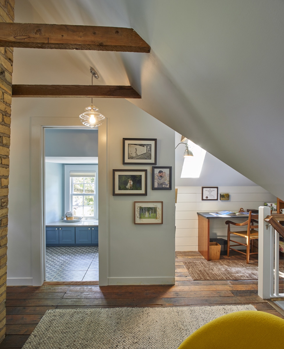 In another remodel of this Lake Phalen home, designers worked to create a cozy retreat with a sitting area, home office nook, and powder room. The Attic’s original wood beams were incorporated into the final design, preserving the character of the space. The artisan-built chimney lends whimsy to the lofty space. Blown glass pendant light fixtures create a vintage-modern feeling to the Attic, while LED lighting illuminates the stairs. A pedestal sink and patterned tile on the powder room floor continue the vintage-inspired design.