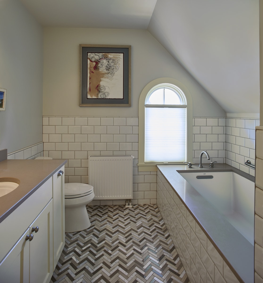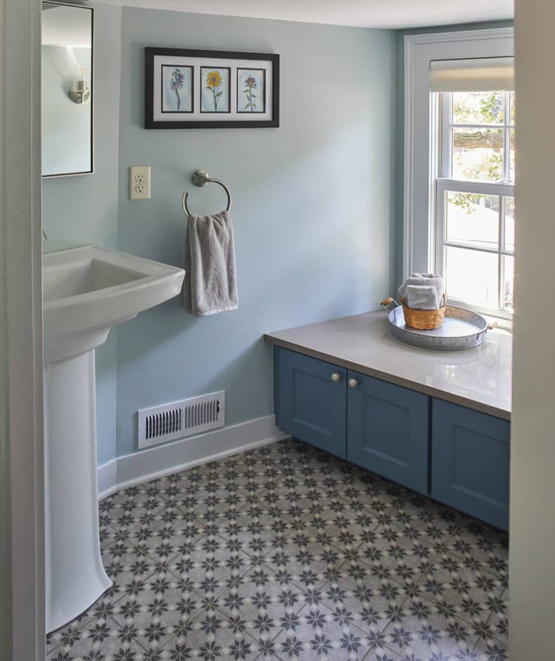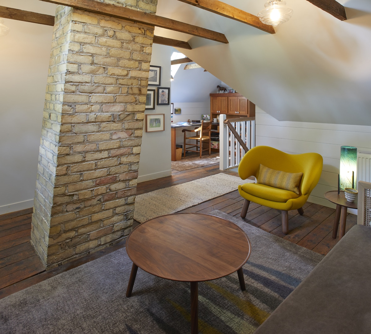 In another remodel of this Lake Phalen home, designers worked to create a cozy retreat with a sitting area, home office nook, and powder room. The Attic’s original wood beams were incorporated into the final design, preserving the character of the space. The artisan-built chimney lends whimsy to the lofty space. Blown glass pendant light fixtures create a vintage-modern feeling to the Attic, while LED lighting illuminates the stairs. A pedestal sink and patterned tile on the powder room floor continue the vintage-inspired design.