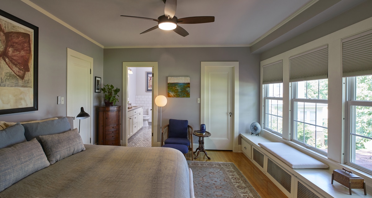 The original architecture did include a primary suite – bedroom, dressing room, and study – but no en suite bath. By moving the dressing room to the study’s location and taking a few feet from the spacious bedroom, we were able to reconfigure the original dressing room into a new luxurious en suite bathroom. A custom door made to match the home’s existing style allows for an old door (to the new bathroom) to be placed on the same wall as a new door (to the bonus closet) without any visible difference.