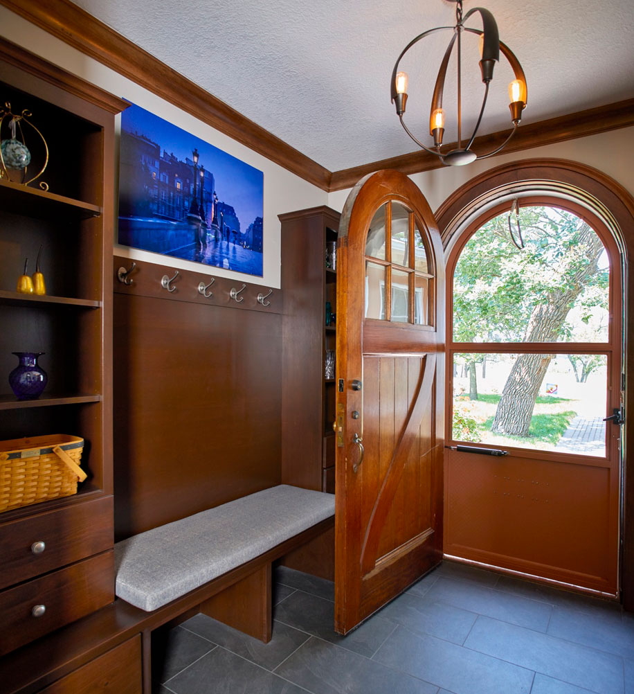 This 1920s Lake Phalen home lacked space for the owners to enjoy their incredible view! Using the lot’s irregular shape, a Sunroom Addition was positioned to take advantage of lake views on three sides. Bumping out the Foyer, reusing the home’s original door, and adding custom cabinetry created a welcoming entry to accommodate large gatherings.