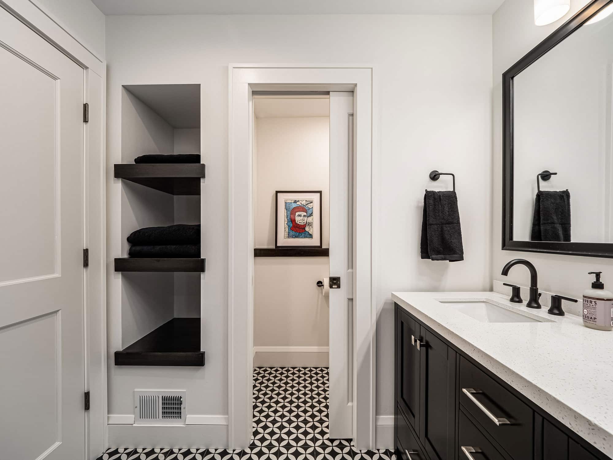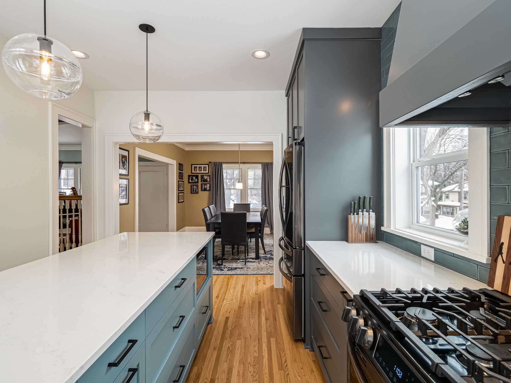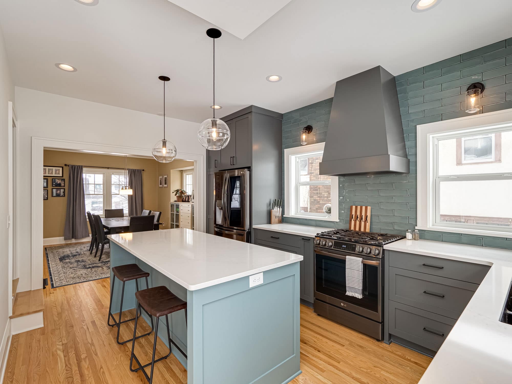 This time around, Susan and the team at White Crane turned their deserted rec room, along with a cramped galley kitchen that was leaking water, into everyone’s favorite space: An in-home movie theater, and a bright, modern dining area.