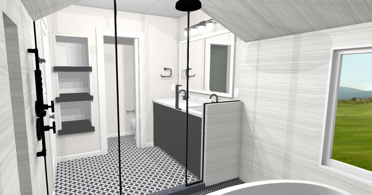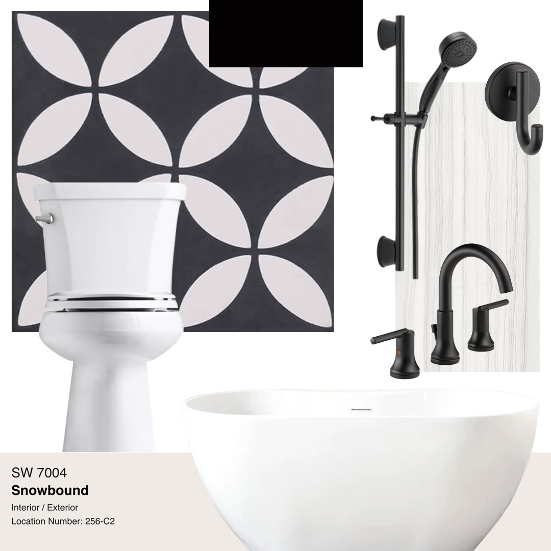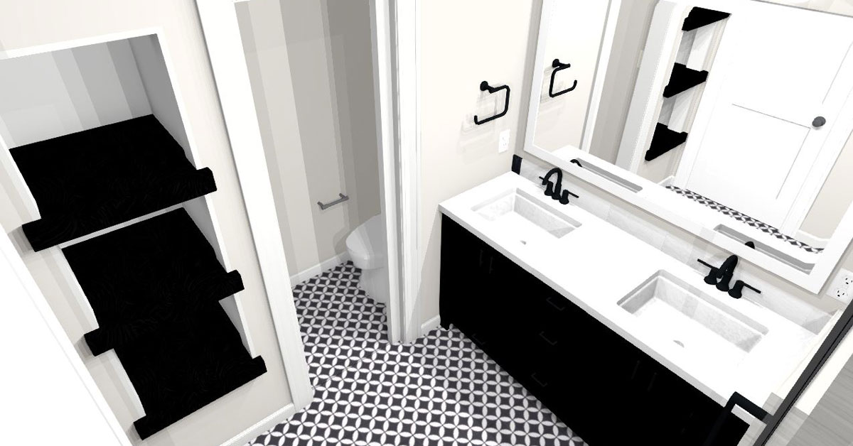 The black and white selections are obvious upgrades and were carefully selected with our designers working alongside our clients to make their ideal bathroom a reality. The black and white mosaic floor stops just shy of the shower where pitch black floor tile and grey and white wall tile create a modern bathroom escape.