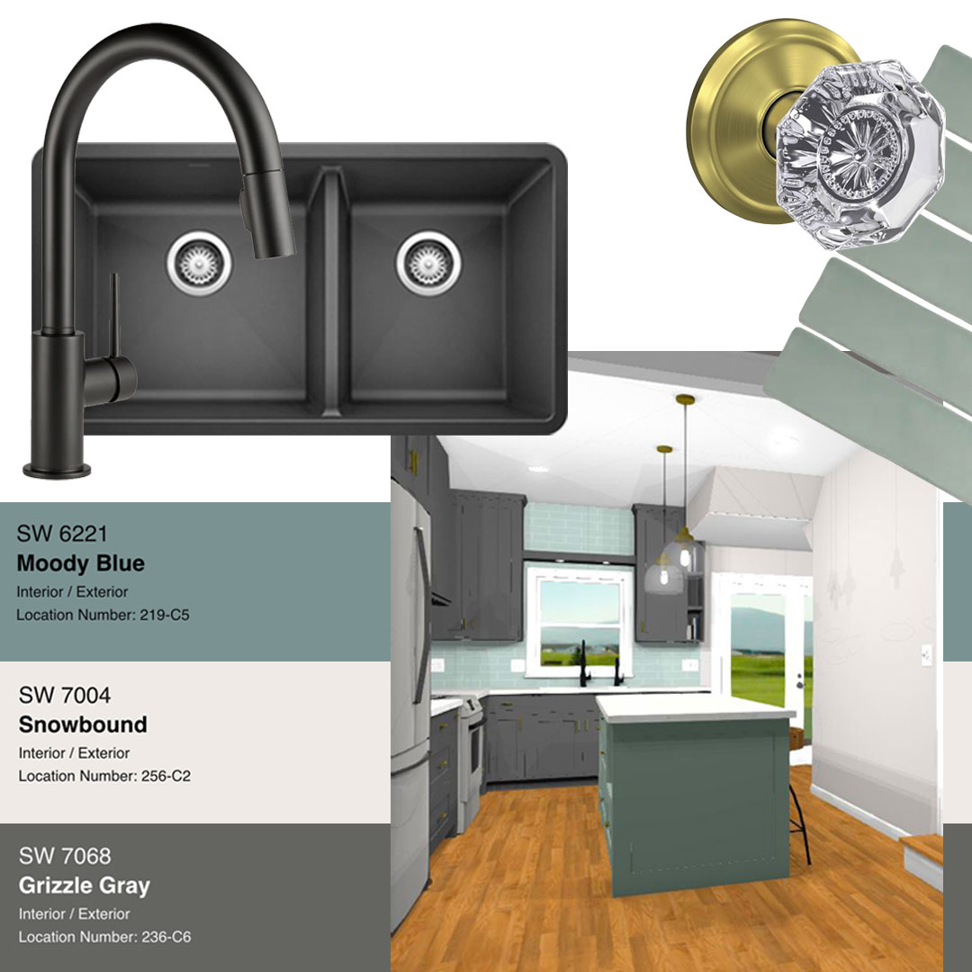 Muted gray cabinets in Sherwin Williams Grizzle Gray offer a quiet nod to the modern selections, complementing the charcoal sink and faucet. Pops of color create an impactful and layered design.