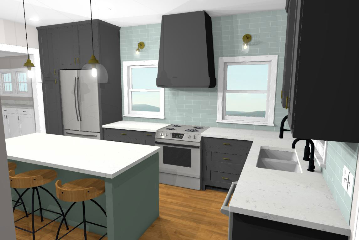 The kitchen rendering by our design team illustrates how the removal of the soffits will impact the kitchen. Now, the kitchen expands into the former banquette area with cabinets that extend to the ceiling above. Without a column limiting the room’s configuration, an impressive island will become a central focal point along with the bold color scheme a shapely hood.