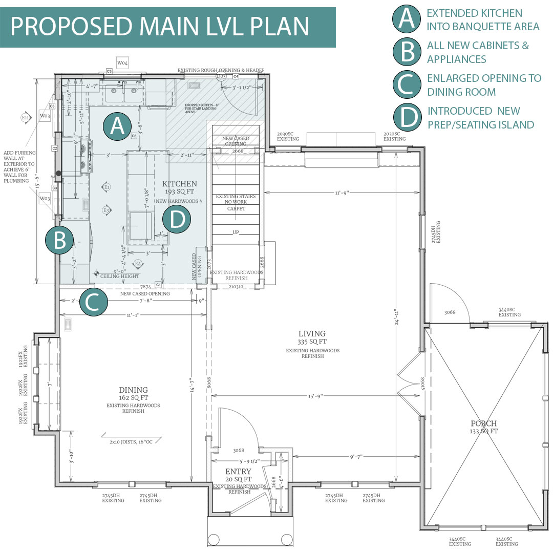 PROPOSED: The large opening between the kitchen and dining room plays a substantial role in increasing maneuverability across the entire floor, as the kitchen would no longer be a pinch point at the back of the home. Newly proposed windows will create a much brighter environment with a generously sized island proving a food prep and informal dining area. All new selections from the refrigerator to the tile and paints are an equally important element of the design scheme.