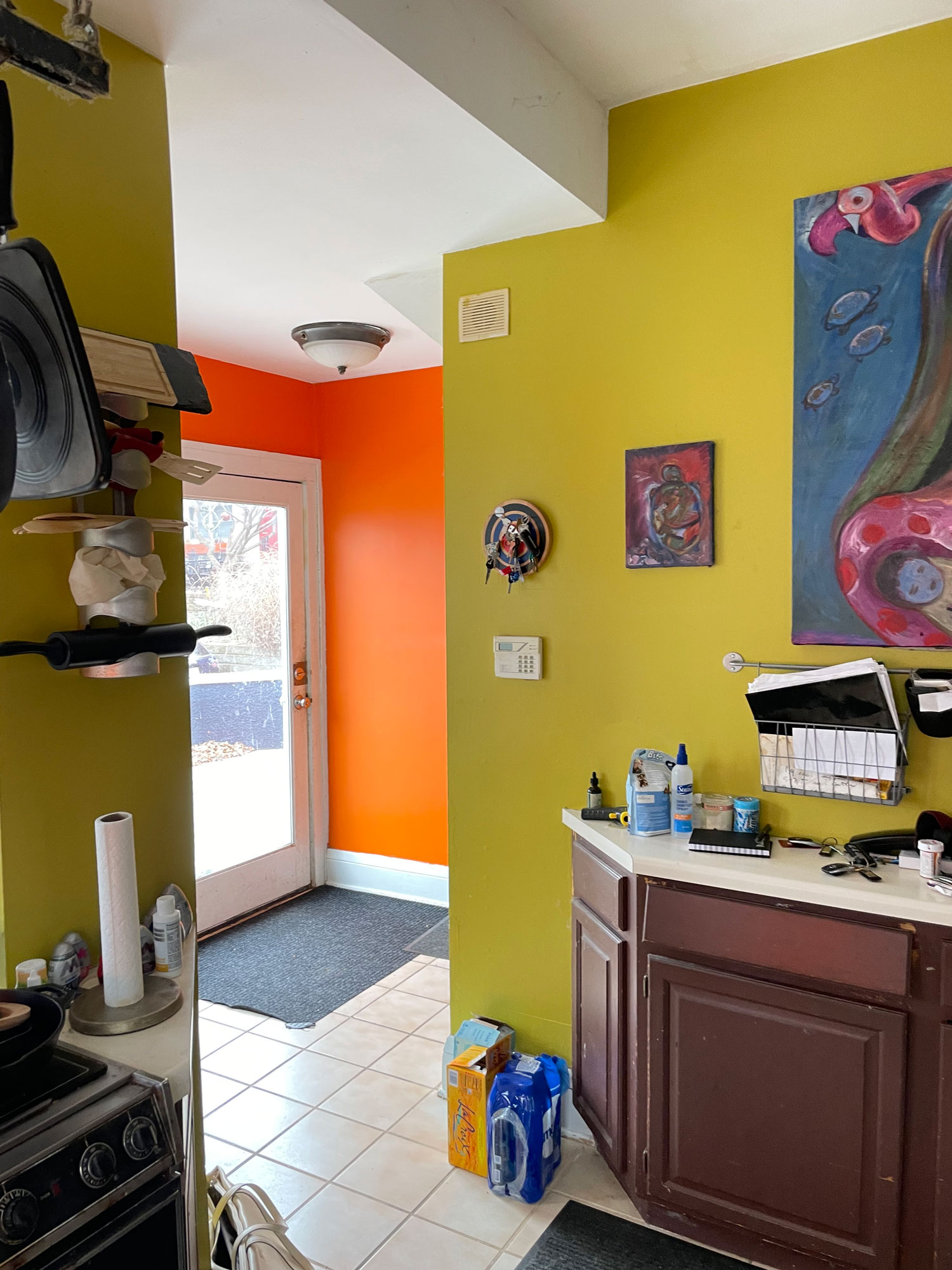 BEFORE | A soffit adjacent to the rear entry of the home encapsulates a sunken jacuzzi tub in the bathroom above and must be removed alongside the nearby column. The exclusion of these elements will open the plan and ease maneuverability throughout the kitchen.