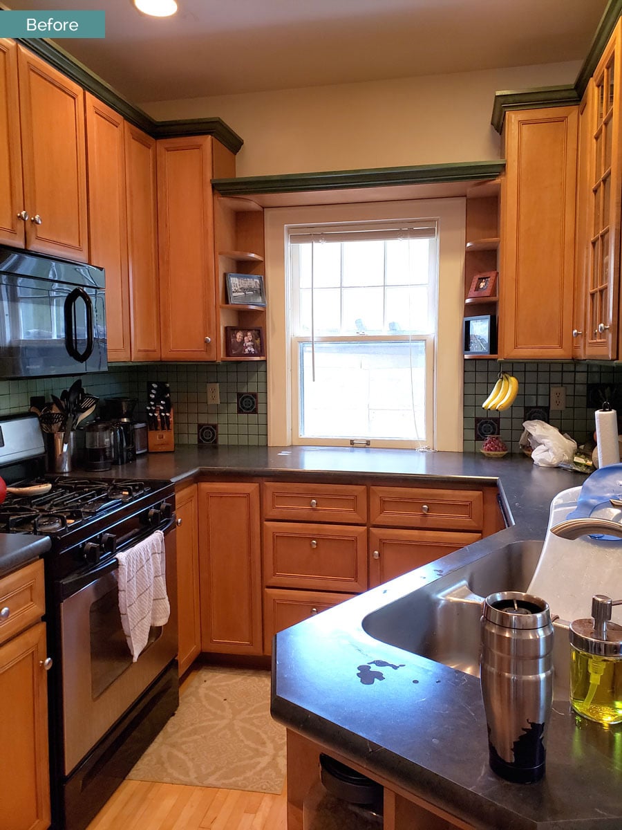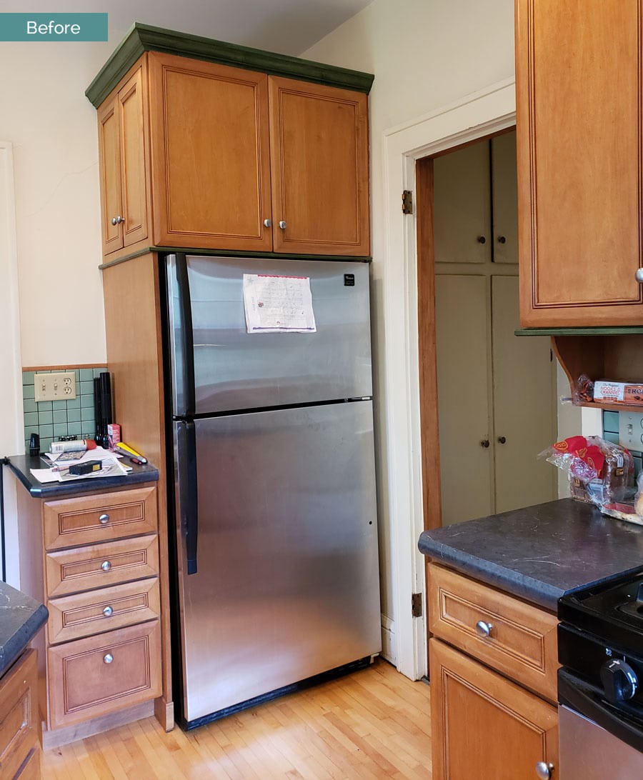 Kitchen Before | Fitting modern appliances into the existing Kitchen was a challenge. The refrigerator was tucked in a corner away from the main cooking and prep areas of the Kitchen.