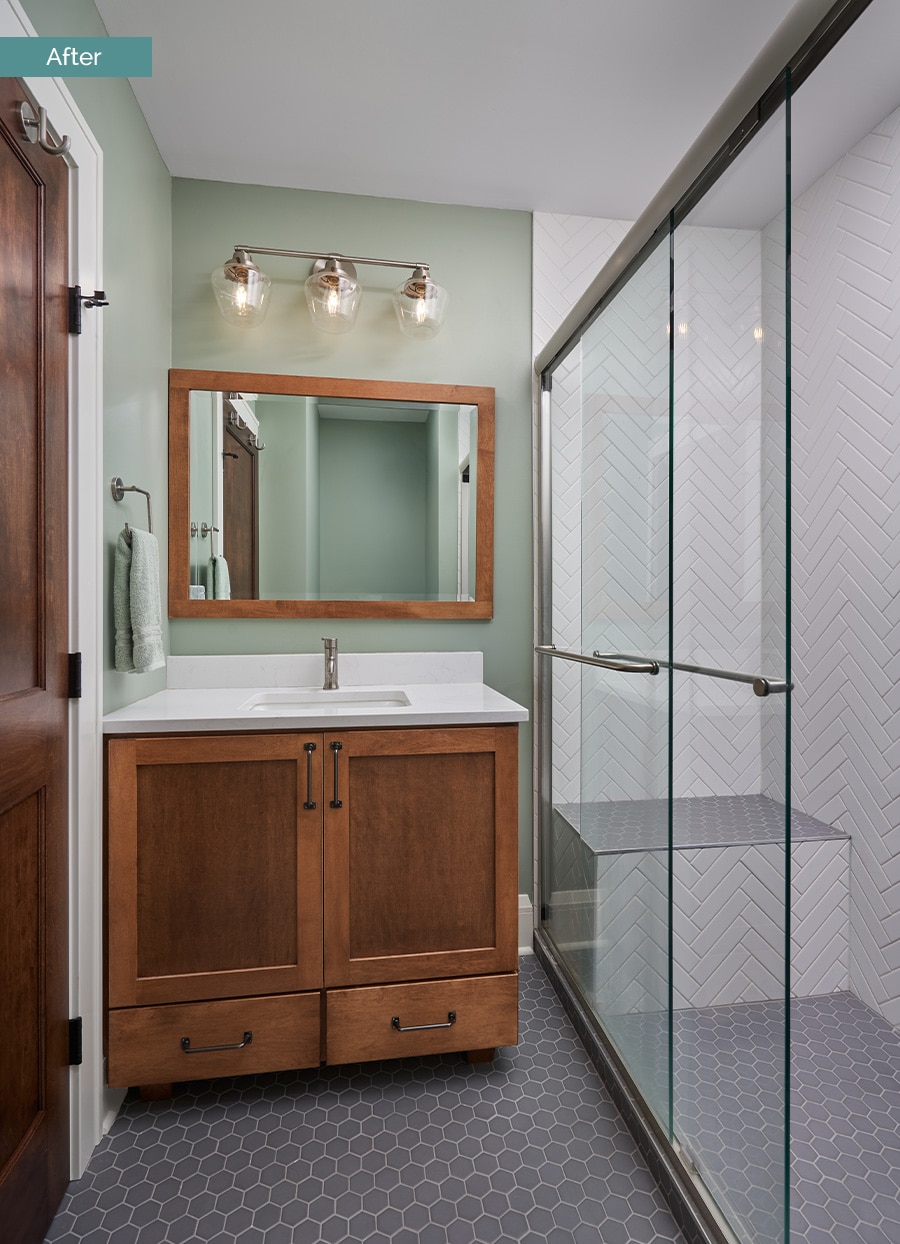 The new 3/4 Bath features a shower with floor to ceiling subway tile laid in a herringbone pattern.