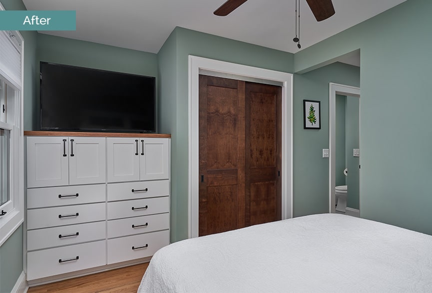 Owner's Bedroom After | The remodeled Owner's Suite has an expanded closet, custom built-in storage, and a new en suite 3/4 Bath.