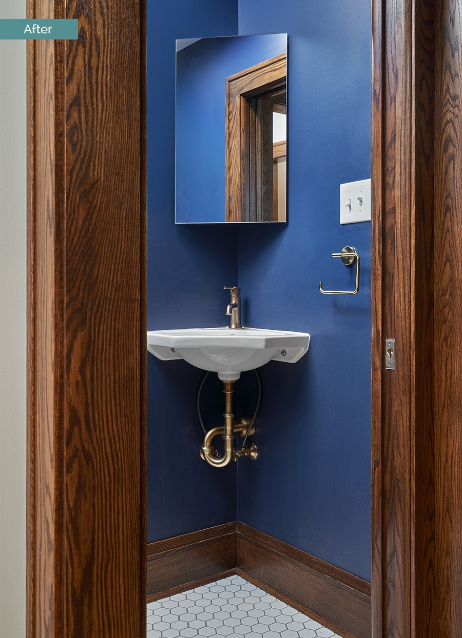 The new Powder Room, in the hallway between the Kitchen and front rooms, has a sliding pocket door and corner sink to save space.