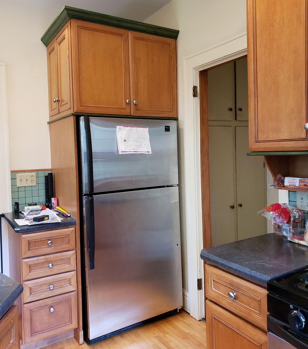 Fitting modern appliances into the existing Kitchen was a challenge. The refrigerator was tucked in a corner away from the main cooking and prep areas of the Kitchen.