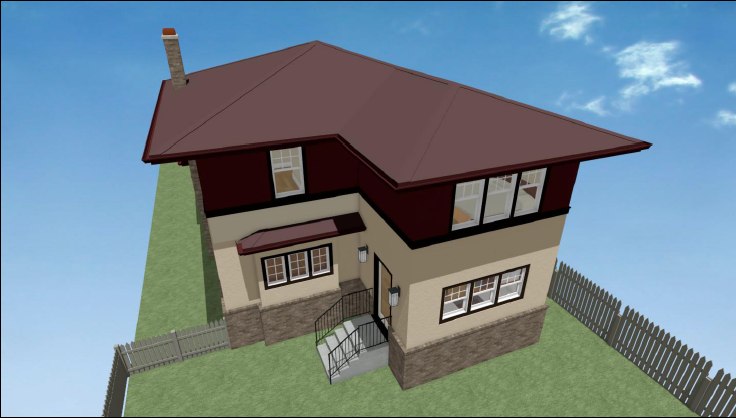 This rendered drawing shows the proposed two-story Addition to the back of the home. The new Kitchen will be on the first floor of the Addition, and the enlarged Owner's suite will be above on the 2nd floor.