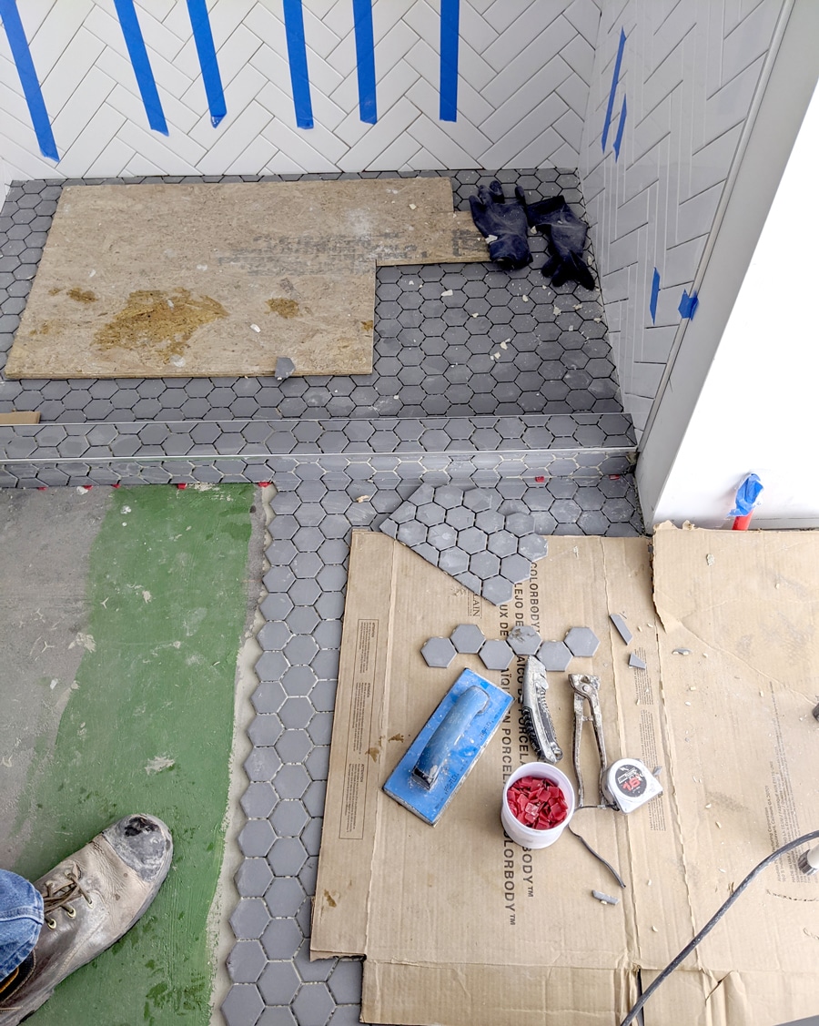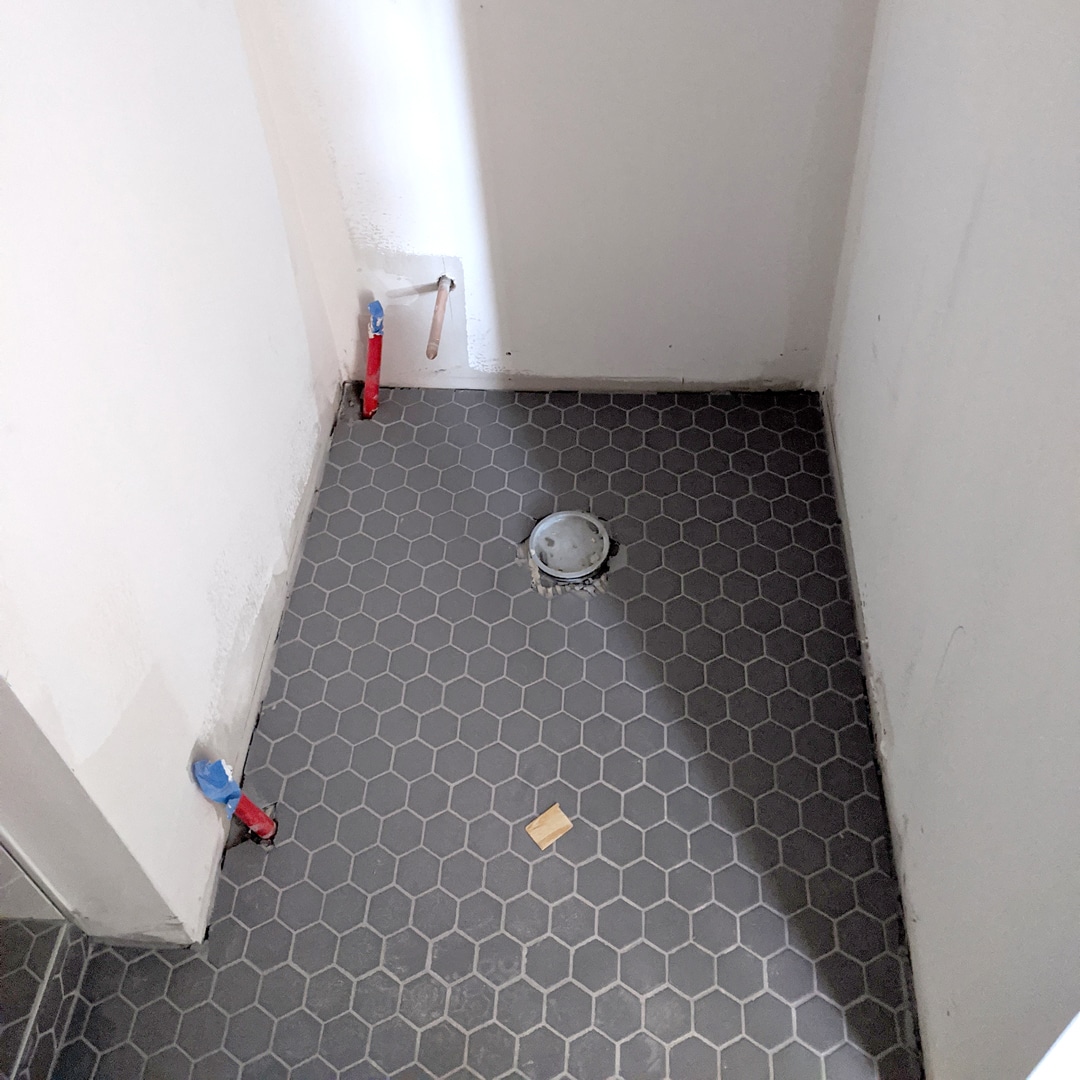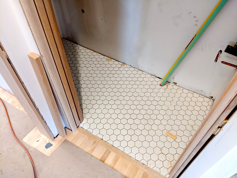 We've set and grouted the white hexagon floor tile in the new main floor Powder Room.