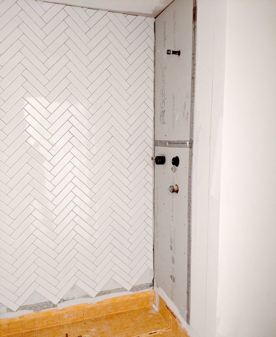 The white gloss subway tile in the upstairs 3/4 Bath shower is set in a herringbone pattern.