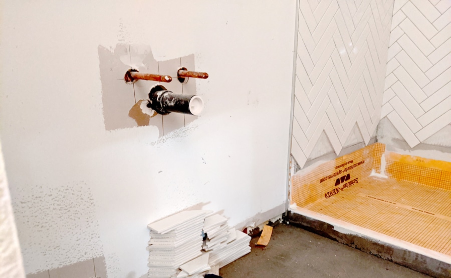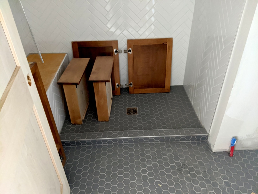 After tiling is complete, we'll install the bath vanity, sink, faucets, and toilet.